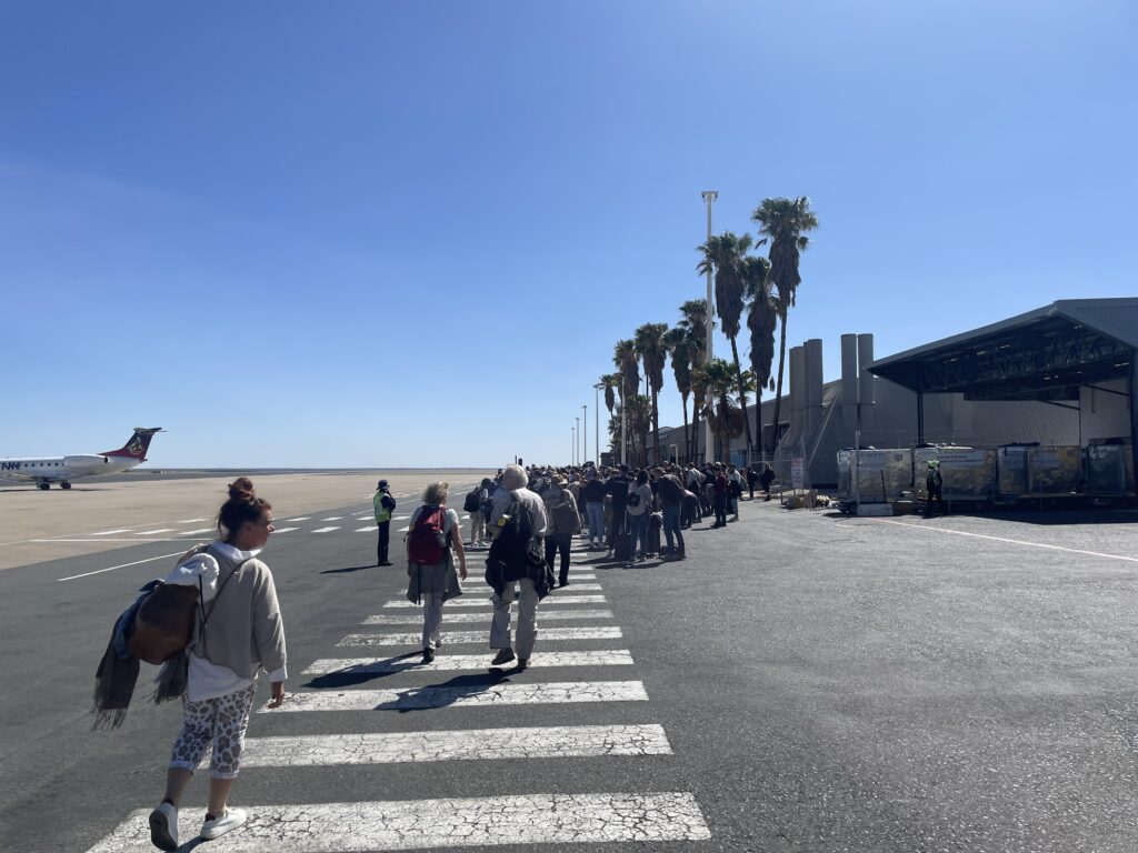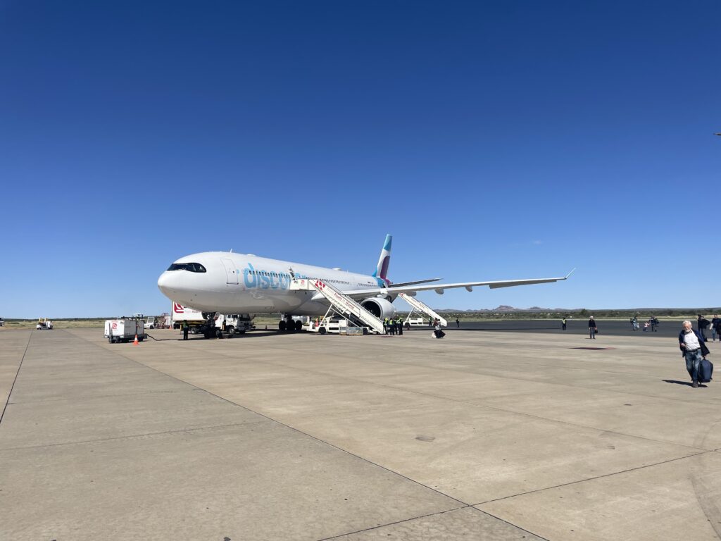 Am internationalen Flughafen Windhoek angekommen war alles sehr besonders und anders. Ich versuche mal zu beschreiben: Der Flughafen besteht aus einem Gebäude, davor ein paar Container. Die Wagen mit Gepäck und Essen usw. wurden von einem Traktor gefahren. Auf dem Rollfeld waren drei Flugzeuge. Eins war unser A330 und dann noch zwei kleine Propellerflieger. Als wir die Treppe runterliefen hatte es 26 Grad und es 9:30. Die Landschaft war hügelig bis bergig und bestand aus Sand, Felsen und kleinen Büschen und Bäumen. Vom Rollfeld konnte man besonders weit schauen. Dazu war es noch sehr still. Vom Flugzeug zum Flughafen Gebäude sind wir gelaufen. Wir wurden von sehr vielen Flughafenmitarbeitern zum Haus gelotst. Alle mit typischem Safarihut gegen die Sonne.