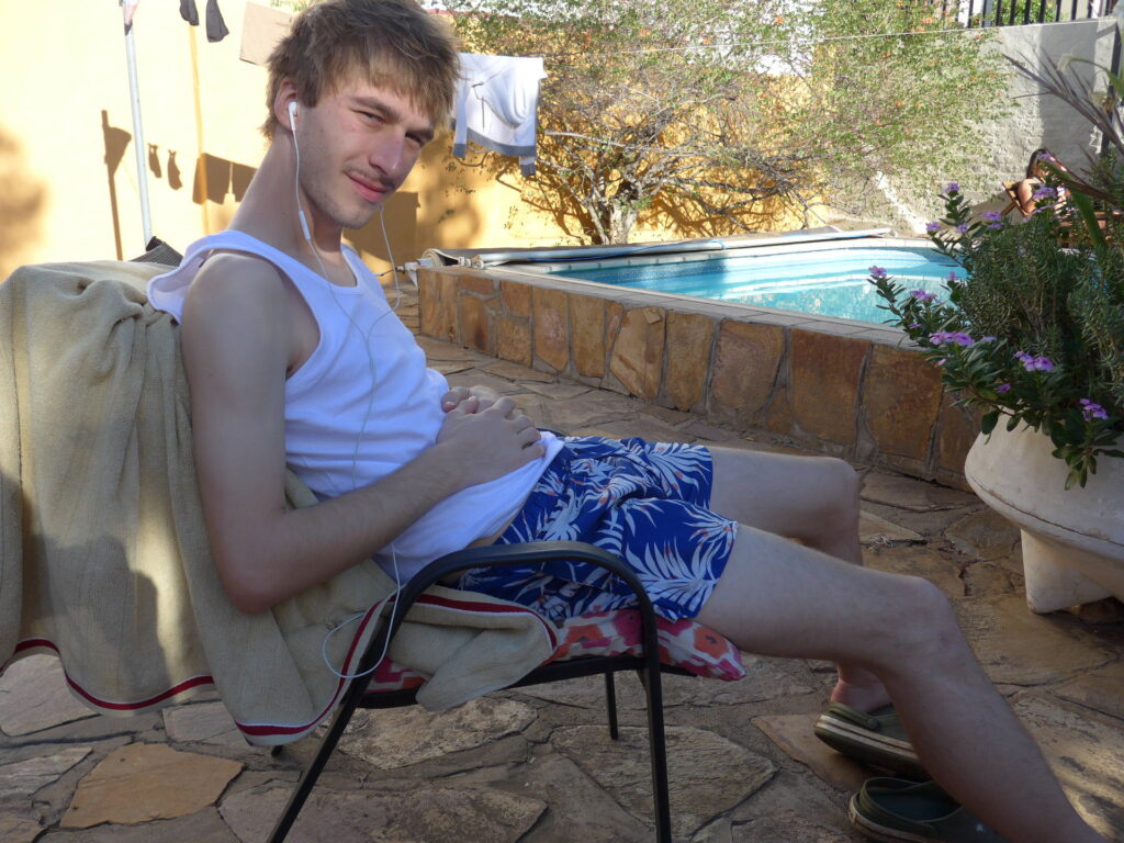 Die Fahrt war schon sehr besonders. Alles war anders: die Natur aber natürlich auch der Linksverkehr. Und so fuhren wir eine Dreiviertelstunde bis in die Stadt. Wir beiden kamen aus dem Staunen nicht mehr heraus und beobachteten die Natur, die Ferienwohnungen der Touristen aber auch die Wellblechhütten der ganz Armen. An beiden Seiten der Schnellstraße waren hohe Zäune gegen Tiere. Was mich besonders verwirrt hat waren die Menschen, die an der Straße gearbeitet hatten. Da gab es alles mögliche: Menschen die für die Polizei gearbeitet hatten und rote Fahnen geschwungen haben zum langsam fahren. Menschen, die Tore bewacht haben oder welche die am Straßenrand aufgeräumt und gebaut haben. Irgendwann kamen dann nach und nach mehr Häuser und schwubs waren wie in Windhoek und am Hostel.