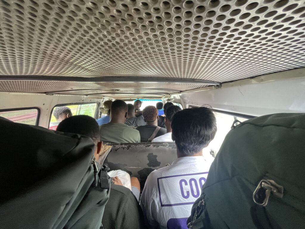 An der nächsten Straße wurden wir dann für nichtmal zwei Euro pro Person in die letzten 20 km in die Stadt genommen. Unser Minibus in die Stadt war so groß wie ein VW-Bus, vollkommen verbeult und kaputt aber er hat funktioniert. In den Bus haben 19 Leute gepasst plus Kinder und Gepäck.