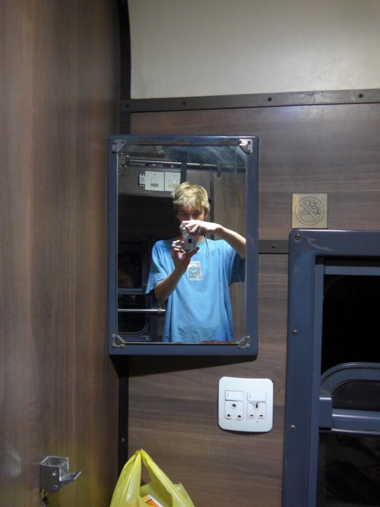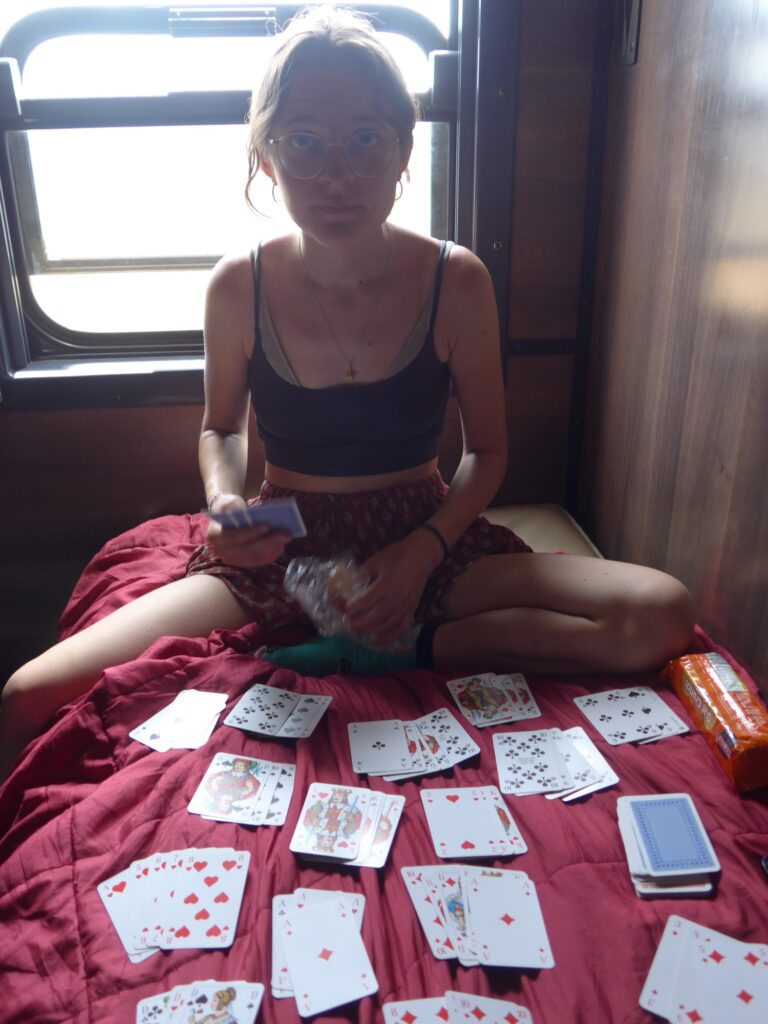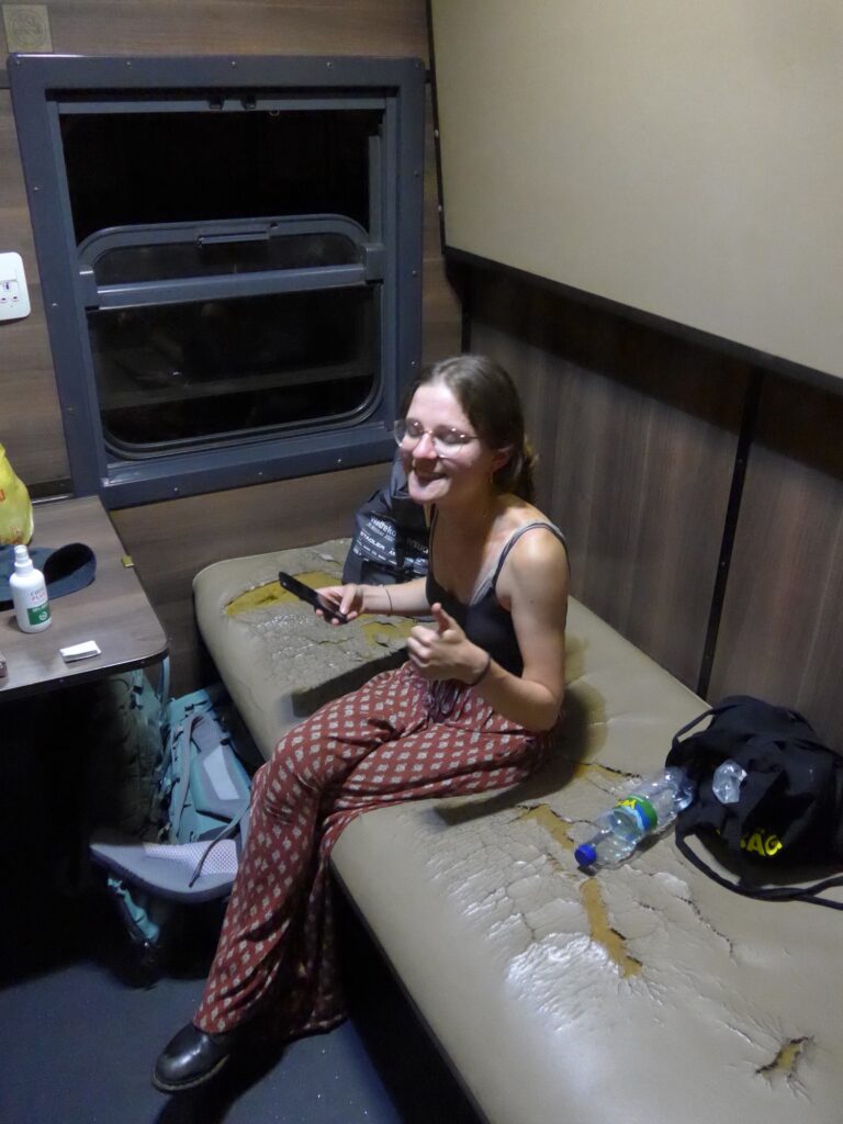 Das war unser Abteil: Zwei Liegen, ein Tisch und ein Fenster das war’s. Die Tür war auch noch kaputt, sodass man sie fast nicht auf und zu bekam. Ich muss sagen, dass ich ein bisschen enttäuscht war. Ich hatte zwar erwartet, dass es alt und ein bisschen ranzig war, aber nicht so eklig und dreckig. Die Liege war sogar so dreckig, dass wir uns die meiste Zeit nur auf den sauberen Schlafsack gesetzt haben. Und ich bin jetzt wirklich kleiner, der alles eklig findet.
