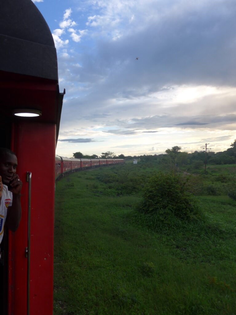 Am Abend habe ich noch ein bisschen aus der offenen Tür geschaut. Das war auch surreal; mit offener Tür bei 30 km/h auf dem Boden sitzen mit Füßen aus dem Wagen und in die grüne Landschaft schauen. Nachdem wir wirklich müde wurden, versuchten wir ein bisschen zu schlafen, was bei dem Schaukeln und Klackern aber schwierig war. Irgendwann schläft man dann eigentlich doch immer ein.